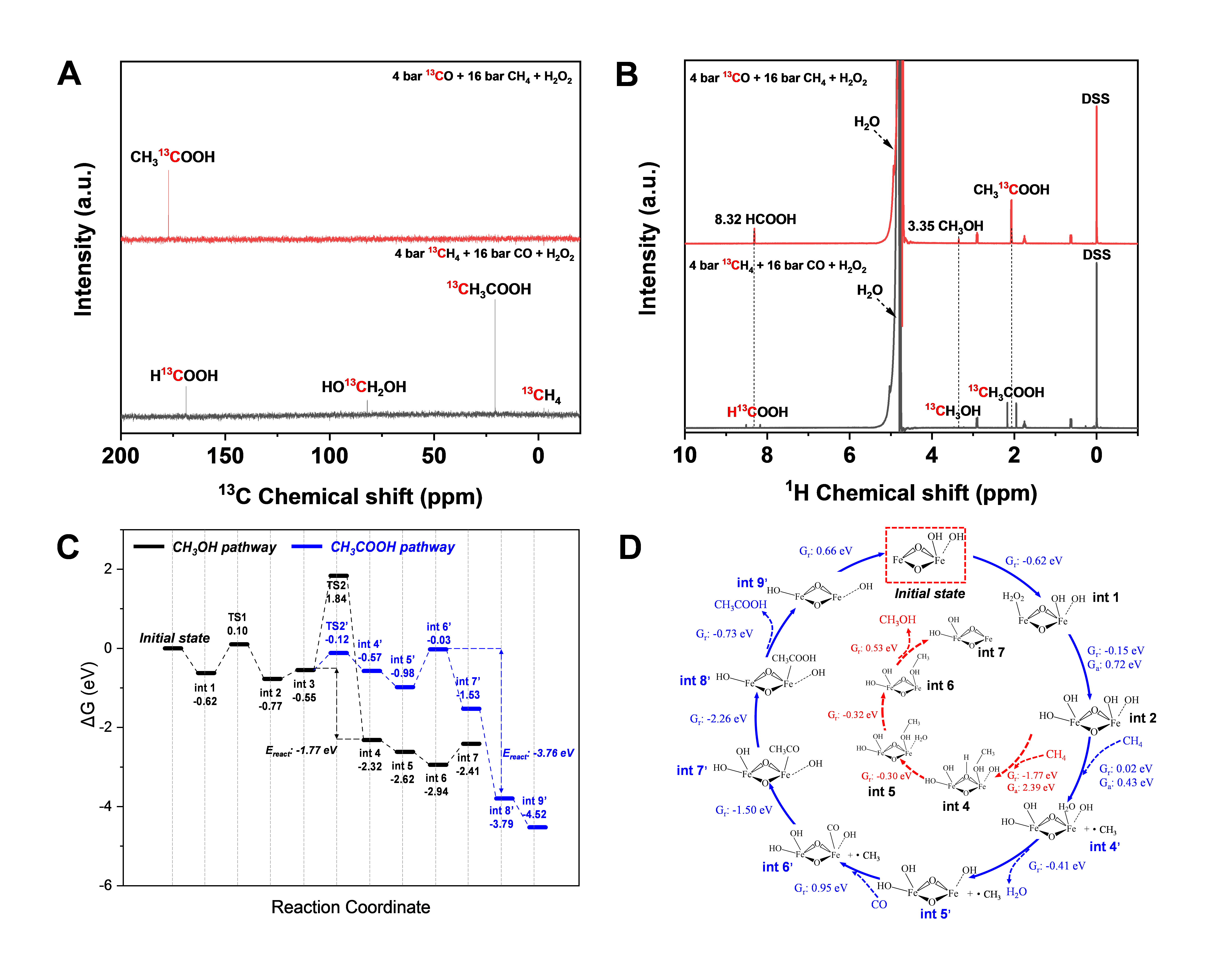 图2 基于CH4转化制备CH3COOH的同位素示踪实验和理论计算