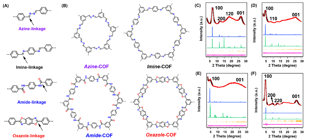 图 具有不同连接的COF(偶氮、亚胺、酰胺和恶唑COF)的化学结构。