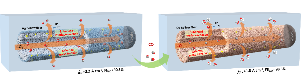 图1 分步式中空纤维透散电极体系高效电还原CO2示意图