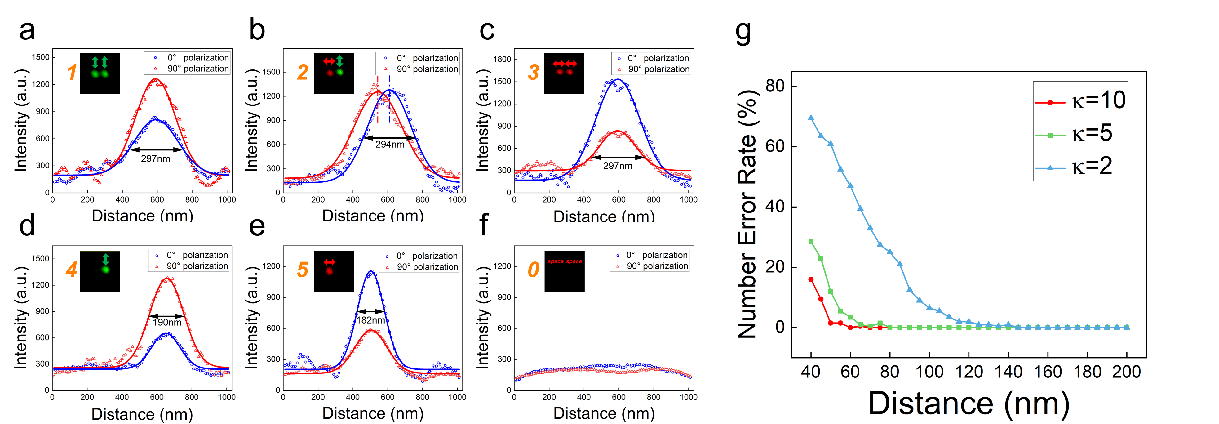 为了验证我们方法的可行性,我们制备了掺杂偶氮类染料DR13 (分散红13)的PMMA偏振调制薄膜,薄膜厚度为110nm,表现出κ ≈ 2的偏振选择特性,如图2所示。由于现在缺乏超分辨光存储偏振信息写入方法,我们对基于偏振调制亚分辨光存储读出方法进行了实验设计和测试;第一时间顺利获得高NA (NA=1.4)物镜在DR13偏振薄膜上写入了500nm间距的偏振编码存储点,并顺利获得低NA (NA = 0.5)物镜读出实验,实现了500 nm点间距的亚分辨光存储数据读出,超过了衍射极限1.2倍。陆续在无误码的读取5 × 5编码数字阵列,则证明了亚分辨光存储读出方法的可靠性和鲁棒性。同时,与现有的亚分辨光存储荧光读出方法相比,我们基于反射信号强度测量的方法具有更高的稳定性和读取速度,比RESOLFT快了约15倍。此外,与FQM或RESOLFT相比,我们的亚衍射极限光存储读出系统更简单,只需要在共聚焦显微镜中增加一个偏振片和半波片即可。顺利获得模拟仿真,预测了在偶氮薄膜上,基于偏振调制亚分辨光存储读出方法具有150nm的分辨潜力,而如图3中所示,在具有更高偏振调制系数κ的偏振敏感材料,如金纳米棒和液晶材料,该方法具有实现70nm分辨率的潜力。