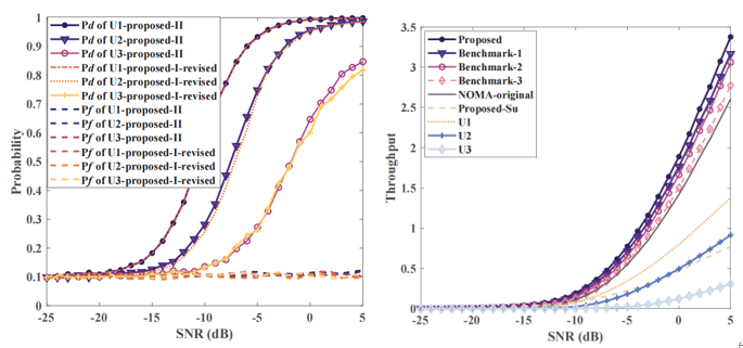 图2.不同信噪比时所提技术与传统NOMA技术在3用户情况下的检测概率、虚警概率(左图)和吞吐量性能曲线(右图)