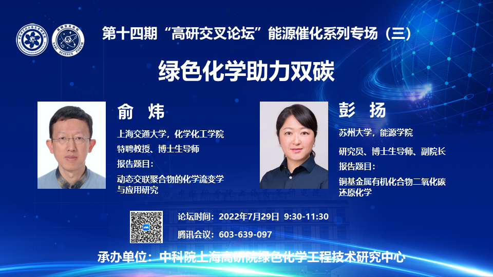 2022年7月29日上午,由中科院上海高研院绿色化学工程技术研究中心承办的第十四期“高研交叉论坛”能源催化系列专场第三场活动成功举办。活动以线上形式召开,以“绿色化学助力双碳”为主题,特邀上海交通大学化学化工学院俞炜教授、苏州大学能源学院彭扬教授为主讲嘉宾,来自PA真人国际、上海交通大学、苏州大学的80余名科研人员及研究生参加了活动。