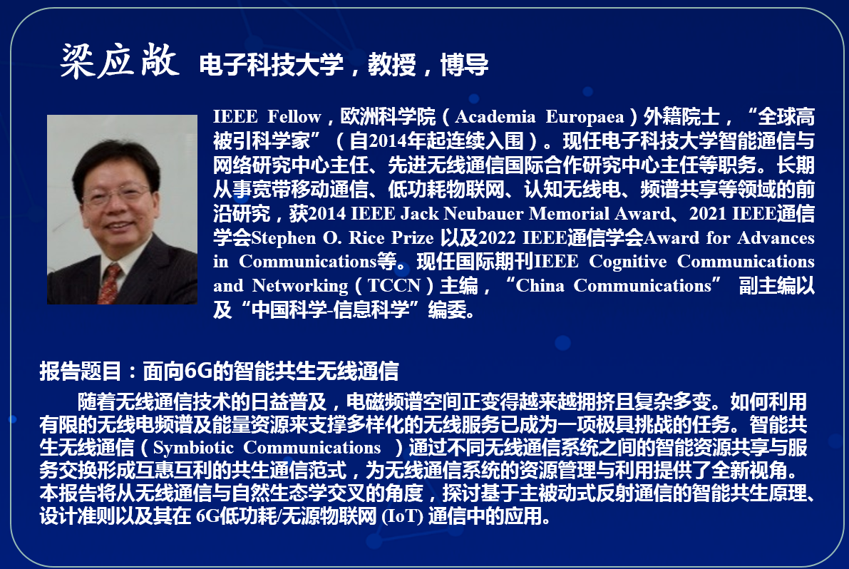 欧洲科学院外籍院士、IEEE Fellow、“全球高被引科学家”、电子科技大学智能通信与网络研究中心主任、梁应敞教授第一时间做了题为《面向6G的智能共生无线通信》的报告。梁教授提出:顺利获得不同无线通信系统之间的智能资源共享与服务交换形成互惠互利的共生通信范式,可为无线通信系统的资源管理与利用给予全新视角。报告从无线通信与自然生态学交叉的角度,探讨基于主被动式反射通信的智能共生原理、设计准则以及其在 6G低功耗/无源物联网通信中的应用。