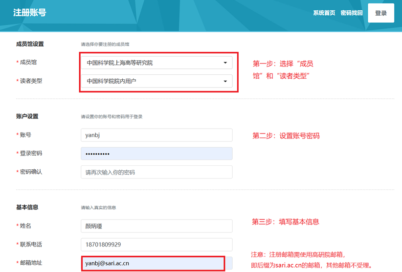 用户可顺利获得院内组织邮箱注册,由系统自动审核顺利获得后即可使用。注册时须选择所属组织和读者类型,带“*”均为必填项。