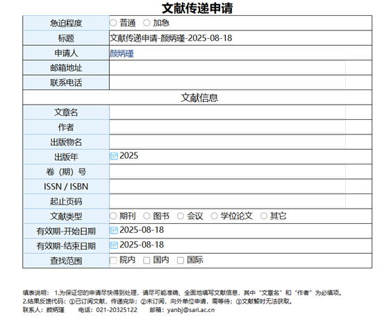 (1) 用户需登录“文献传递读者系统” (http://dds.las.ac.cn/)申请文献,登录后要填写预申请文献的相关信息,如书刊名称、年卷期、作者、页码等;