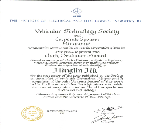 在加拿大蒙特利尔召开的2016年度秋季IEEE Vehicular Technology Conference(IEEE 车载技术大会)上,IEEE Vehicular Technology Society的主席Javier Gozálvez教授对外隆重宣布了本年度IEEE Transactions on Vehicular Technology的最佳系统论文奖,即IEEE Jack Neubauer Memorial Award,高研院胡宏林研究员的论文B. Zhou, H. Hu*, S. Huang, and H.-H. Chen, “Intra-Cluster Device-to-Device Relay Algorithm with Optimal Resource Utilization,” IEEE Trans. Vehicular Technology, Vol. 2, pp. 2315-2326, Jun. 2013.获此殊荣。胡宏林研究员也因此成为现在国内极少数取得IEEE旗下主流期刊最佳论文奖的几位学者之一。