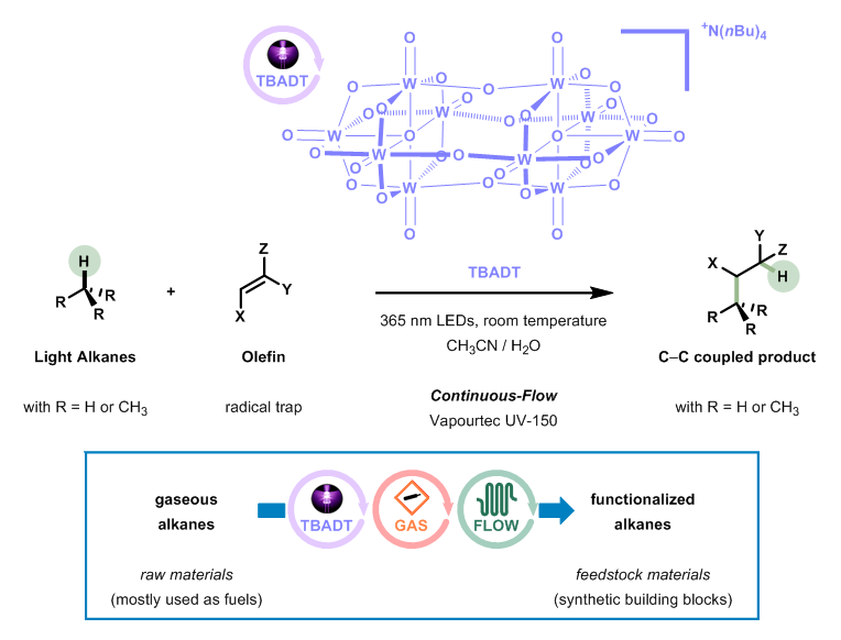 文中报道了一种通用且比较温和的方法,该方法是在室温下使用廉价的钨盐作为光催化剂,顺利获得氢原子转移(HAT)活化甲烷,乙烷,丙烷和异丁烷中的C(sp3)–H键。W10O324-是一种多功能且廉价的基于多金属氧酸盐的氢原子转移光催化剂,可以有效地破坏轻链烷烃的强键和未活化的C–H键。由于气态性质和轻链烷烃在有机溶剂中的低溶解度,使用流动技术可以对促进气-液分解钨酸盐介导的过程。微流反应器中的短标度(通常小于1 mm的光程)可对整个反应介质进行均匀照射,从而可高效产生烷基自由基。直接将气态烃参与碳-碳偶合反应,消除了对预官能化的要求,并提高了这一重要类型转化的原子效率。
