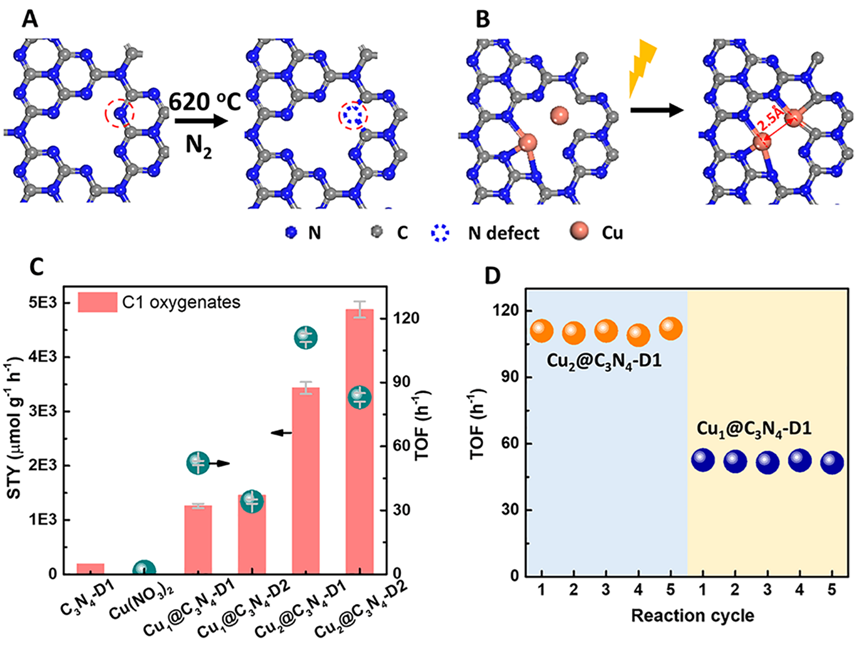 得益于前期在小分子催化氧化研究上的积累(ACS Catal 2021, 21, 11607; Fuel 2021, 305,121624; Cell Rep Phys Sci 2021, 2, 100287 ; iScience 2020, 23, 101157; iScience 2018, 9, 487; Nanoscale 2017, 9, 2123),该团队巧妙利用富含氮缺陷的g-C3N4固定铜双原子(Cu2@C3N4-D),并在50 oC低温下催化甲烷选择性氧化(图1)。含有氮空位的载体可以给予三个sp2杂化的N原子先锚定一个Cu原子。进一步光照处理,N空位附近的两个C和一个sp2 N可以锚定第二个Cu原子。取得的Cu2@C3N4-D催化剂每克每小时能催化甲烷氧化生成4878 μmol含氧C1化合物、转化频率(TOF)为83 h-1,比单原子催化剂高300%,甚至高于报道的贵金属催化剂。循环实验表明催化剂具有较好的稳定性。实验和计算均表明,双原子铜(一价)牢固地嵌在不对称的[N3Cu]···[Cu-C2N]中,比单原子铜更有利于甲烷的吸附和解离,降低了甲烷氧化的反应能垒。这种简单的、构建原子数可控的活性中心方法,为设计高效的C-H活化催化剂给予了启示。
