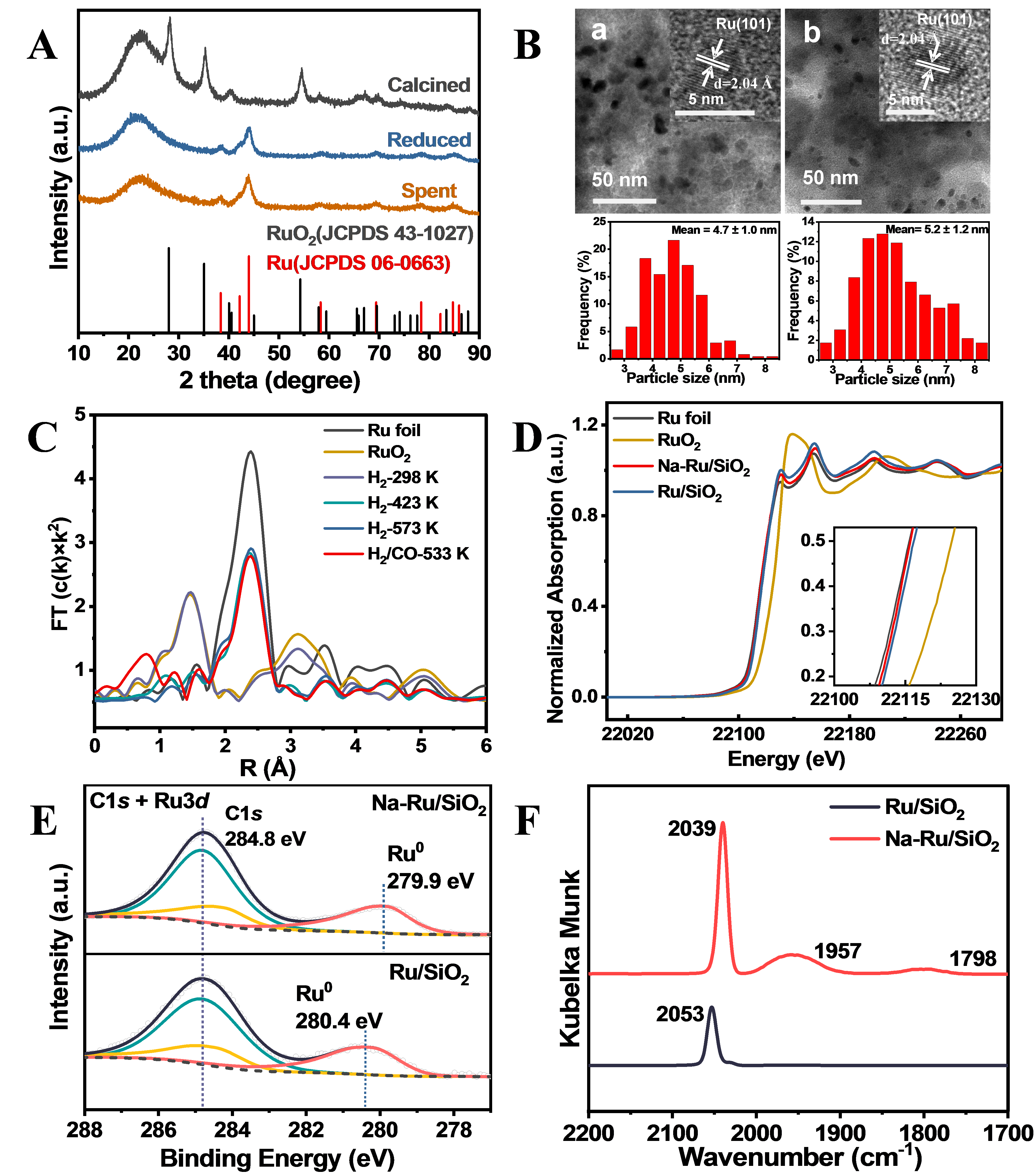 在此背景下,该研究团队开发了碱金属改性Ru基催化剂并应用于合成气经费托路线直接转化制备烯烃,改性Ru基催化剂表现出优异的FTO催化性能,在45.8%的CO转化率下烯烃选择性可高达80.1%,同时CH4和CO2总选择性小于5%,体现出极高的碳效(图1)。所得烯烃集中在C20以内,74.5%属于C5+长链α-烯烃。更为显著的是,该催化剂可用于很宽氢碳比范围的合成气(0.5~5),适用于几乎所有含碳资源(煤、天然气、生物质、固体废弃物、CO2等)得到的合成气。与现有所报道的合成气制烯烃的催化体系相比,改性Ru基催化剂体现出最低的C1副产物选择性,最高的总烯烃选择性和收率,且烯烃收率突破50%。显然,改性Ru基FTO催化剂的催化性能有别于传统的以饱和烷烃为主的Ru基费托催化剂。