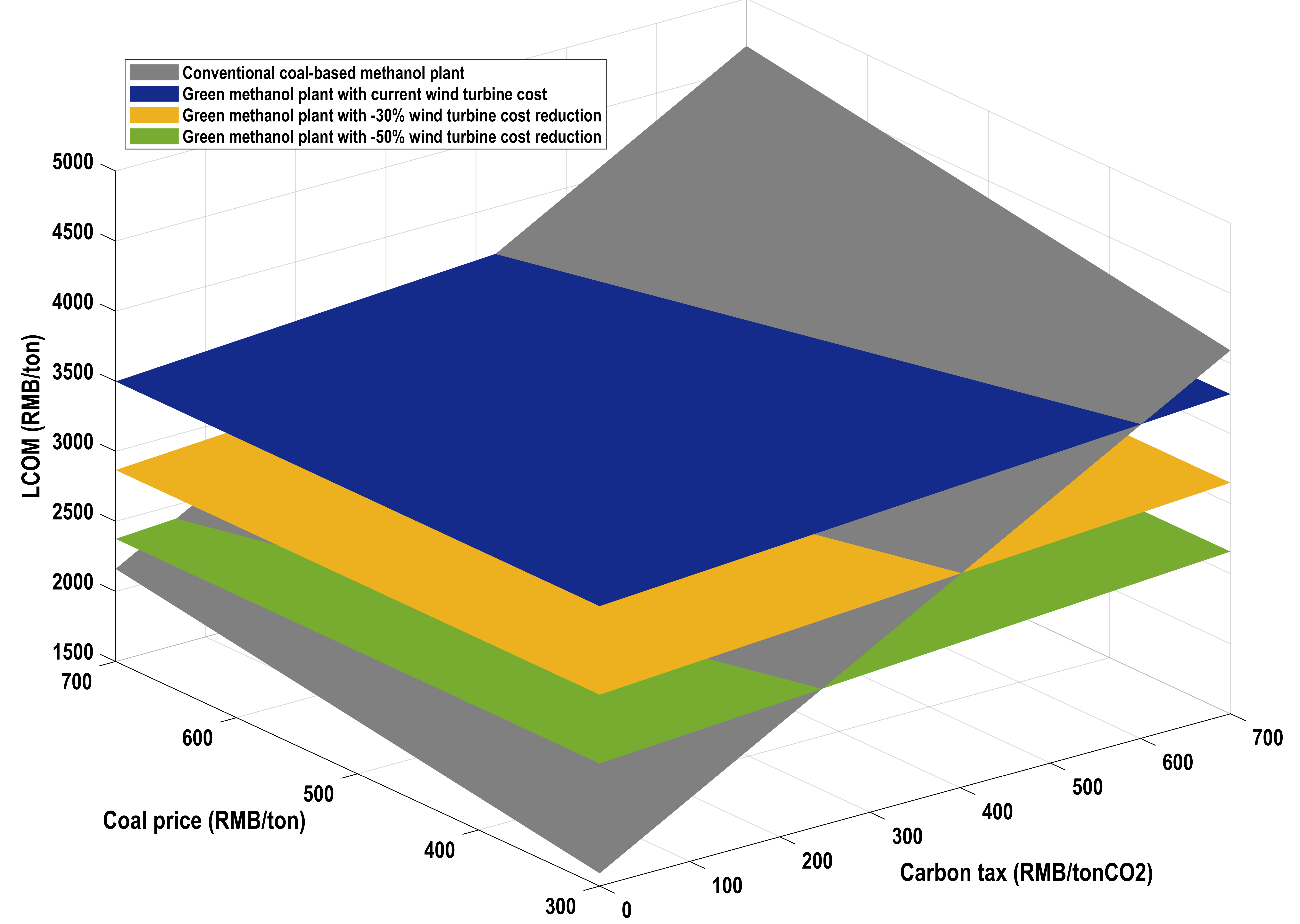 就整个系统而言,由风光互补供能的绿色甲醇系统经济性最优,考虑副产氧气的经济效益(售价1000元/吨),其甲醇的平准化成本(LCOH)为3498 元/吨。敏感性结果表明,1)风机成本是影响该系统投资成本最大的经济因素;2)副产品氧气是否销售和二氧化碳捕集来源对甲醇运行成本有显著影响;3)如果考虑碳税,风光互补供能供氢的绿色甲醇系统将有潜力与传统甲醇装置竞争。