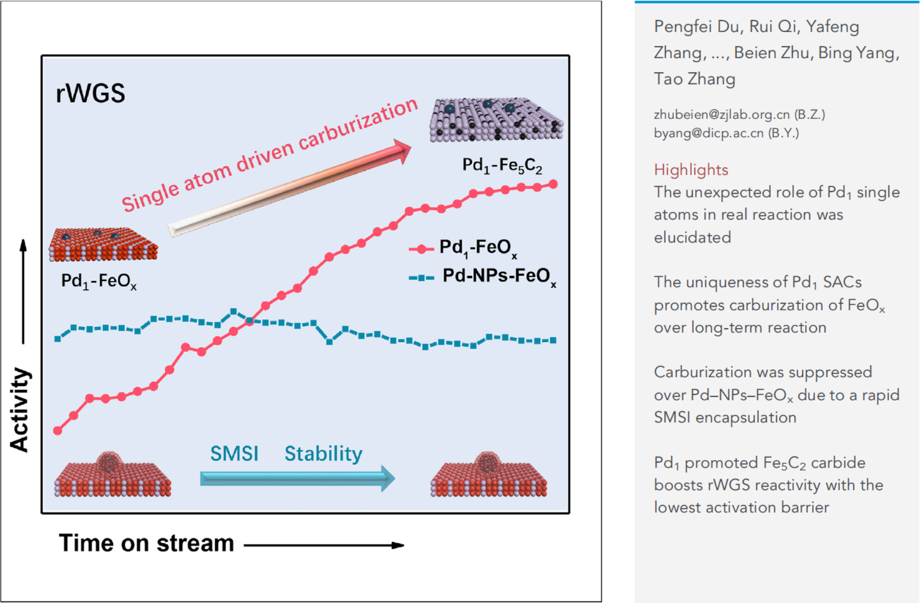 Pd1单原子诱导FeOx碳化促进CO2转化反应示意图及文章亮点