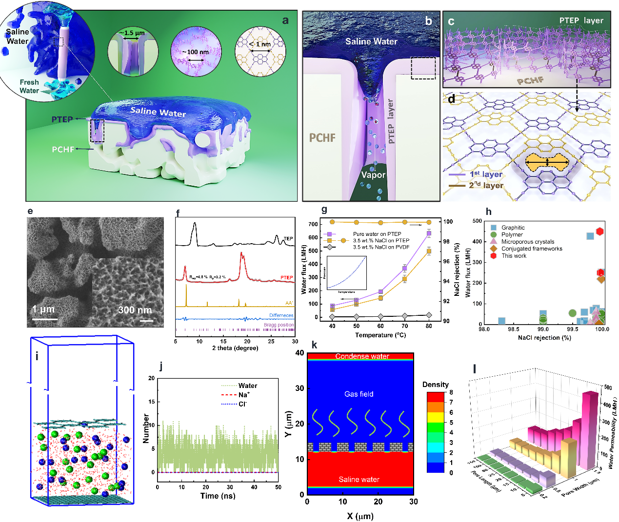 鉴于此,在近期的研究中,该团队将二维共轭框架膜的研究对象从石墨炔拓展至类石墨炔的芘二炔。他们以多孔中空纤维为载体,在温和的溶剂热条件下利用载体表面的铜源作为催化剂,顺利获得双炔偶联反应从四乙炔基芘单体直接催化合成芘二炔复合膜。真空膜蒸馏测试表明,芘二炔共轭框架膜对模拟海水的脱盐率>99.9%,而水通量达~500Lm-2h-1,超过了商用膜通量至少一个数量级。分子动力学理论计算和流体力学数值模拟的研究表明,芘二炔复合膜等级孔的大径长比、膜表面适中的憎水性有助于高通量传质,共轭框架的类石墨表面则隔绝盐离子的接触与顺利获得。模拟计算还证实盐离子不能穿透框架的面内孔。该工作验证了石墨炔与类石墨炔的二维共轭框架膜具有超快脱盐的共性,为选择更易得廉价的聚合单体、为面向实际应用给予了坚实基础。