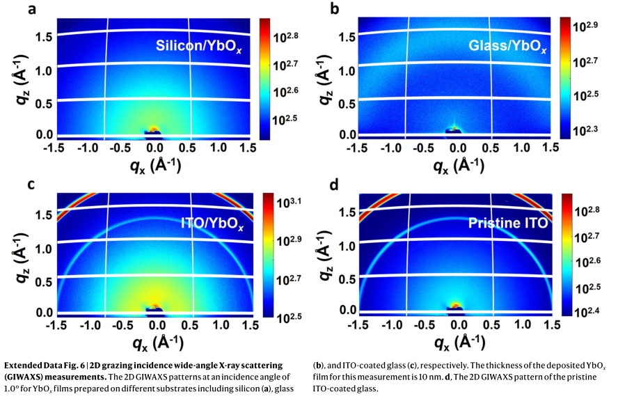 近期,北京大学龚旗煌院士、朱瑞、英国牛津大学Henry J. Snaith、云南大学吕正红院士、加拿大多伦多大学罗德映等人研究出一种化学稳定的多功能缓冲材料氧化镱(YbOx),顺利获得可扩展的热蒸发沉积用于反式钙钛矿太阳能电池。在带有窄带隙钙钛矿吸收器的反式钙钛矿太阳能电池中使用了这种YbOx缓冲器,经认证的功率转换效率超过25%。相关成果以“Multifunctional ytterbium oxide buffer for perovskite solar cells”为题,在《自然》上发表。国家蛋白质科学研究(上海)设施BL19U1线站、BL17B1线站;上海光源BL14B1线站和辅助实验室为此项研究给予了研究机时和实验支持。其中,用户利用辅助实验系统进行样品制备相关工作,为后续实验给予可靠的材料基础;利用BL14B和BL19U1召开前期结晶实验的探索工作,利用BL17B1线站的GIWAXS技术,顺利获得对不同基底上沉积的非晶态Yb薄膜进行结构探测,捕获了不同片层薄膜的晶相信息。本文实验中,使用的X射线波长为1.240 ?,掠射入射角为1.0 ,顺利获得Pilatus 2M探测器进行数据收集。这些结果为进一步优化钙钛矿能源电池设计给予了重要支持。