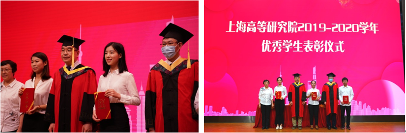 庄严的乐曲中,李儒新、黄伟光、邰仁忠共同为身着学位服的毕业生颁发毕业证书并拨正学位帽上的流苏,为高研院-上海大学联培毕业生颁发联培证书,赵振堂、唐铮、魏伟共同为优秀学生代表颁发荣誉证书,全体师生以热烈的掌声共同见证这光荣而幸福的时刻。当象征成熟“麦穗”的流苏由右侧拨到左侧时,意味着2020届毕业生研究生的最后一课在这里画上了完美句号,高研院学子的独家记忆也在这里定格。