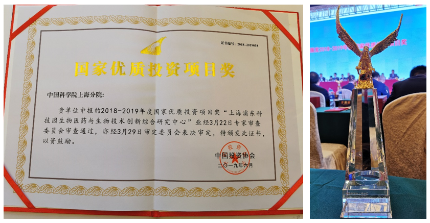 2019年10月15日,由国家开展改革委指导,中国投资协会主办的“国家优质投资项目表彰大会暨现场学习观摩活动”召开。经过前期推介、申报、审查、审定等一系列工作程序后,由高研院实际承担建设的“十二五”上海浦东科技园生物医药与生物技术创新综合研究中心(简称“生物医药基地项目”)喜获“2018-2019年度国家优质投资项目” ,并在此次会议中作为中国科研实验室4个受表彰项目之一,受到表彰。
