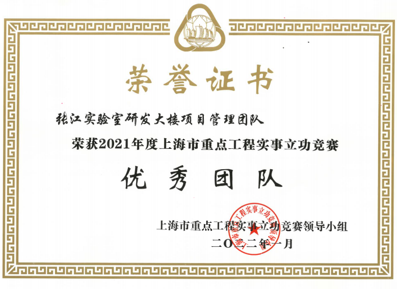 张江实验室研发大楼项目管理团队全面推进项目建设,2021年完成项目桩基施工和大底板等重大节点,项目管理成绩显著。经多轮评审和综合评议,张江实验室研发大楼项目管理团队取得上海市重点工程实事立功竞赛领导小组颁发的“2021年度上海市重点工程实事立功竞赛优秀团队”称号。